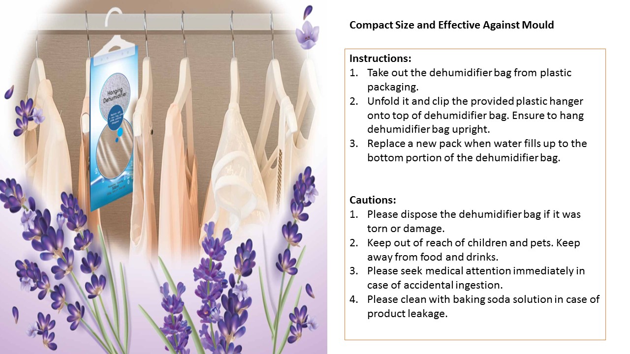2.Unfold it and clip the provided plastic hanger onto top of dehumidifier bag. Ensure to hang dehumidifier bag upright.